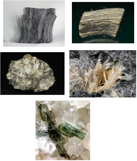 O grupo dos anfibólios tem estrutura cristalina e de cadeia dupla de silicatos, que dão origem a fibras retilíneas e duras. O interior de sua estrutura é constituído por cátions metálicos encapsulados, o que os diferencia da crisotila, onde a molécula de magnésio está mais exposta. Essa característica geométrica faz com que as fibras dos anfibólios sejam mais quebradiças, rompendo-se no sentido do comprimento e gerando partículas mais finas com maior poder de penetração no organismo (Bernstein et al., 2005). Incluídas nesta família, a crocidolita (amianto azul) e a amosita (amianto marrom) são as duas versões de maior relevância comercial; por outro lado, a antofilita, a tremolita e actinolita não possuem relevância comercial (Mendes, 2001; Castro, Giannasi e Novello, 2003). A Figura 2 apresenta as morfologias típicas das variedades crocidolita, amosita, antofilita, tremolita e actinolita.