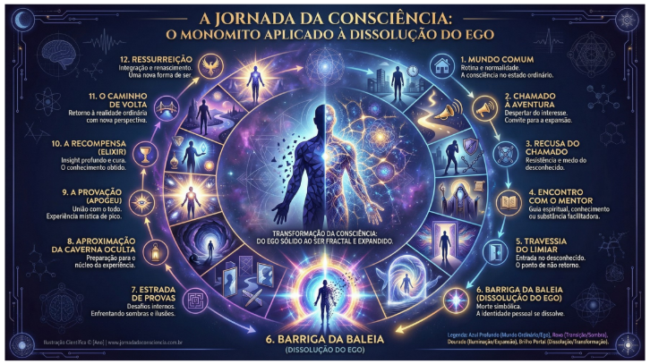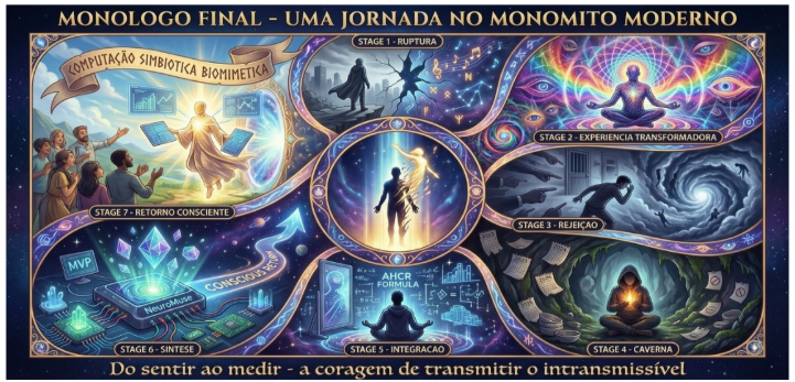 Ilustração conceitual inspirada na estrutura do monomito, representando as etapas do processo humano de ruptura, experiência transformadora, rejeição, interiorização, integração, síntese e retorno consciente. A narrativa visual articula elementos simbólicos, cognitivos e tecnológicos para expressar a trajetória do pesquisador contemporâneo diante de estados limítrofes de consciência, da formulação teórica da AHCR e do desenvolvimento do sistema NeuroMuse. A figura sintetiza, em linguagem simbólica, o percurso que vai da experiência subjetiva à formalização científica e à validação experimental.