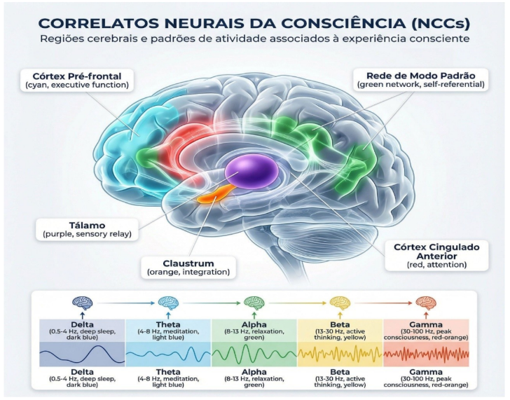 Representação esquemática das principais regiões cerebrais associadas aos correlatos neurais da consciência (NCCs), incluindo córtex pré-frontal, córtex cingulado anterior, rede de modo padrão, tálamo e claustrum, bem como a distribuição espectral das oscilações neurais (delta, theta, alpha, beta e gamma).