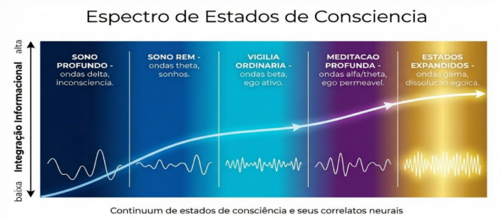 Ritmos lentos estão associados à regulação corporal e homeostática; frequências intermediárias contribuem para a estabilização do estado cognitivo; e oscilações em faixa gama surgem em momentos de integração máxima, frequentemente correlacionadas a estados de percepção unificada, insight e presença consciente ampliada.