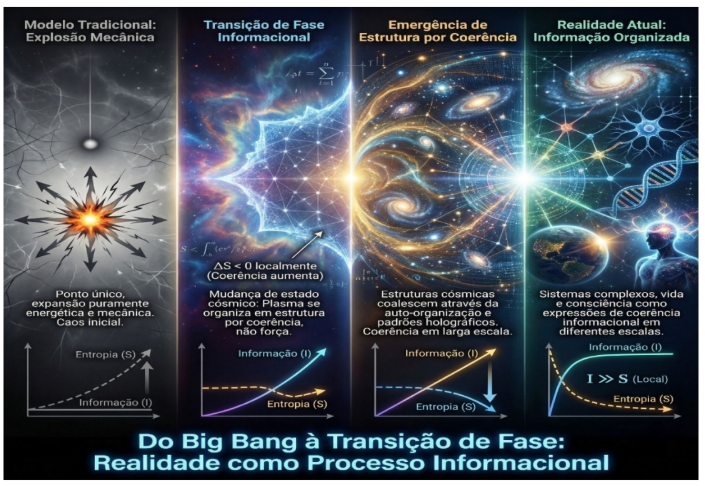 Em consonância com avanços recentes da cosmologia teórica, incluindo a gravidade quântica, o princípio holográfico e a teoria da informação quântica, sustenta-se que o Big Bang deixa de ser compreendido como uma explosão material em um espaço preexistente e passa a ser interpretado como uma transição de fase informacional.