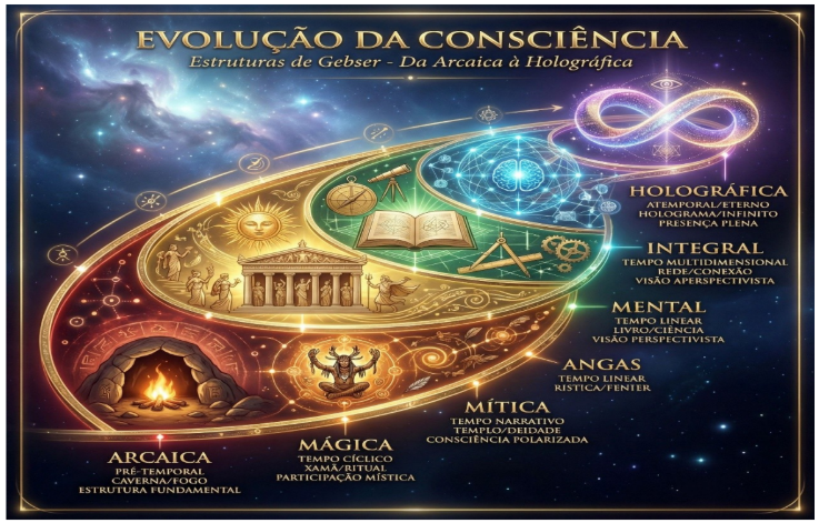 Jean Gebser amplia essa discussão ao propor que a consciência não apenas se transforma individualmente, mas evolui historicamente em estruturas distintas.