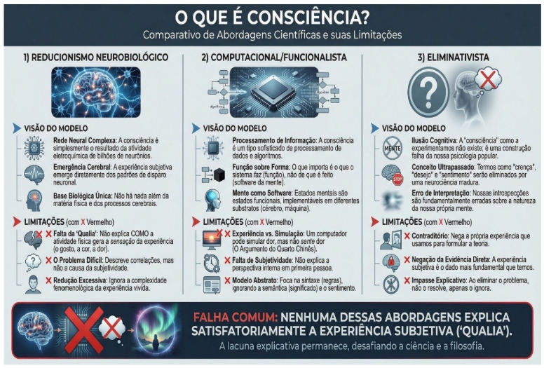 3. Abordagens eliminativistas, que chegam a questionar a própria existência da consciência como entidade distinta, tratando-a como uma ilusão cognitiva.