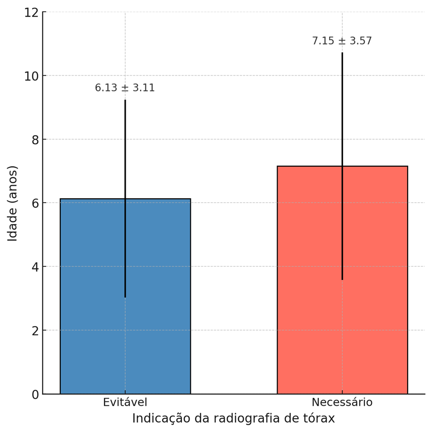 O perfil dos participantes avaliados na pesquisa foi bem homogêneo, sendo 48% do gênero masculino e 52% do gênero feminino. A média de idade dos pacientes submetidos à radiografia de tórax sem indicação clínica foi de 6,13 ± 3,11 anos. Já entre aqueles cuja solicitação do exame foi considerada justificável, a média de idade foi de 7,15 ± 3,57 anos (Figura 1). A análise estatística não identificou diferença significativa entre os grupos em função da idade (p > 0,05).