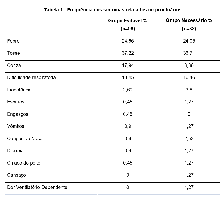Os sintomas mais prevalentes entre os pacientes foram febre e tosse, os quais, somados, representaram mais de 60% dos relatos em ambos os grupos. Alguns sintomas foram observados exclusivamente no grupo cuja solicitação da radiografia foi considerada evitável, como episódios de engasgo. Por outro lado, no grupo em que o exame foi considerado necessário, os sintomas mais frequentemente associados foram cansaço e dor ventilatório dependente (Tabela 1) (p > 0,05).