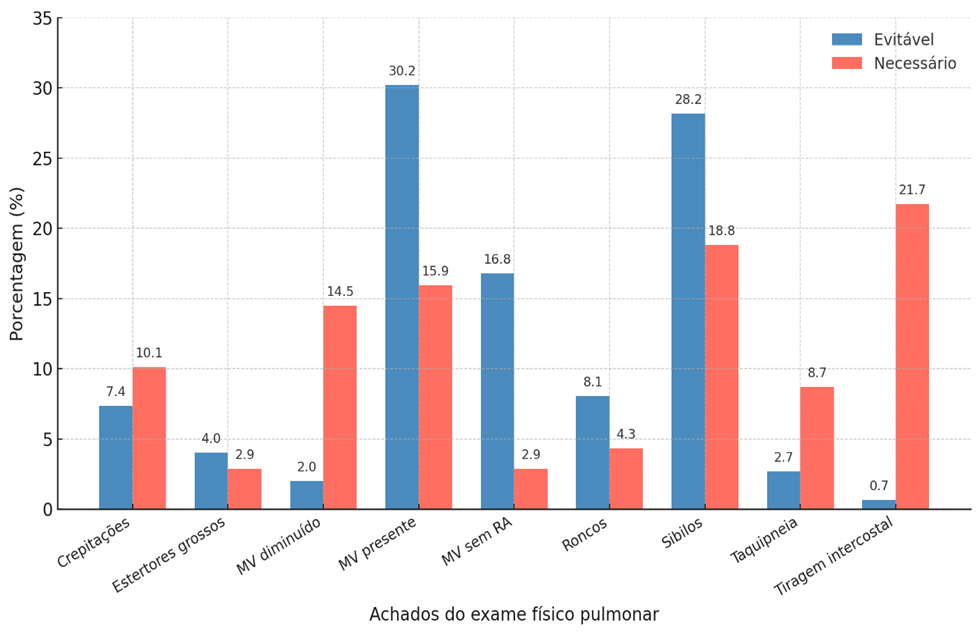 A análise de comparação dos achados do exame físico pulmonar entre os grupos de pacientes com solicitação de radiografia considerada necessária e evitável evidenciou uma diferença estatisticamente significativa na distribuição das alterações clínicas (p < 0,001). A medida de associação, expressa pelo V de Cramer (V = 0,53), indicou uma associação de magnitude forte entre os achados clínicos e a justificativa para a solicitação do exame de imagem. Ou seja, determinadas alterações no exame físico estão fortemente relacionadas à necessidade clínica do exame de imagem.