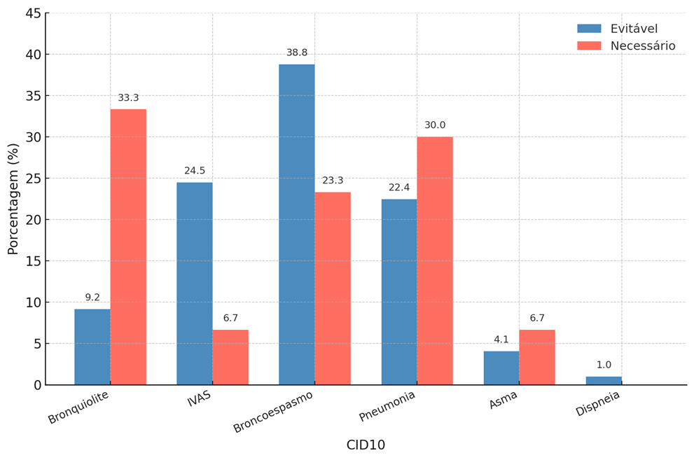 Entre os diagnósticos analisados, bronquiolite (33,33%) apresentou a maior contribuição para a diferença entre os grupos, sendo mais frequente entre os pacientes cuja radiografia foi considerada necessária. Por outro lado, o diagnóstico de infecção de vias aéreas superiores (IVAS) (24,49%) esteve mais associado aos casos em que o exame foi classificado como evitável, refletindo um padrão de solicitação menos justificado diante do quadro clínico. O broncoespasmo (38,78) também contribuiu para a diferença, com maior predominância no grupo evitável (Figura 3).