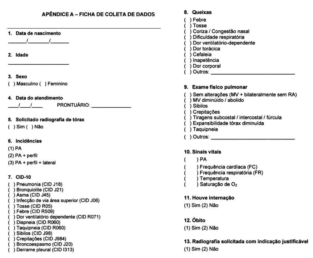 A coleta dos dados foi realizada mediante o preenchimento de uma ficha (apêndice A) elaborada pelos autores, a qual contém informações extraídas através dos registros descritos pelos médicos nas fichas de atendimento, presentes nos prontuários da população pediátrica atendida na emergência do hospital que foi submetida a radiografia torácica. Para o preenchimento da tabela, os autores extrairam informações da anamnese e exame físico das fichas que constavam as seguintes hipóteses diagnósticas descritas no campo de registro do CID-10: tosse (CID R05), febre (CID R50.9), dor ventilatório dependente (CID R07.1), dispneia (CID R06.0), taquipneia (CID R06.0), sibilos (CID J98), crepitações (CID J98.4), broncoespasmo (CID J20), asma (CID J45), infecção de via área superior (CID J06), bronquiolite (CID J21), pneumonia (CID J18) e derrame pleural (CID I31.3).