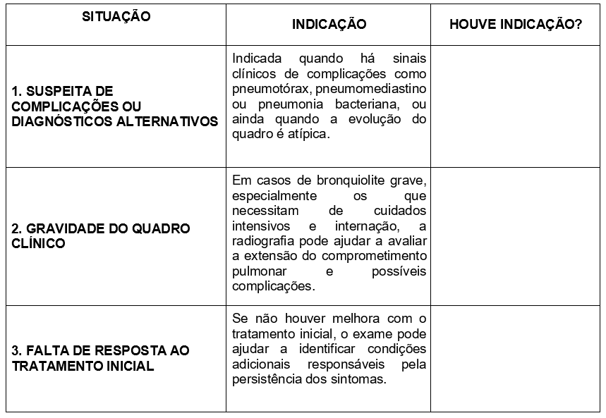 Na bronquiolite viral aguda a radiografia de tórax também não é recomendada de forma rotineira. O diagnóstico dessa condição é predominantemente clínico, baseado na avaliação dos sintomas e exame físico. A solicitação de radiografias deve ser reservada para situações específicas, tais como: 1- Suspeita de complicações ou diagnósticos alternativos: Quando há indícios clínicos que sugerem a presença de complicações como pneumotórax, pneumomediastino ou pneumonia bacteriana, ou quando a evolução do quadro é atípica; 2- Gravidade do quadro clínico: Em casos de bronquiolite grave, especialmente aqueles que requerem cuidados intensivos, a radiografia pode ser útil para avaliar a extensão do comprometimento pulmonar e identificar possíveis complicações; 3- Falta de resposta ao tratamento inicial: Se a criança não apresenta melhora com as medidas terapêuticas iniciais, a radiografia pode auxiliar na identificação de outras condições que possam estar contribuindo para a persistência dos sintomas. Assim, Deve ser considerada uma medida de exceção. Como instrumento de caracterização de gravidade, também possui limitações, já que pacientes podem ter formas graves de apresentação da doença com uma radiografia de tórax normal (Sociedade Brasileira de Pediatria, 2018).