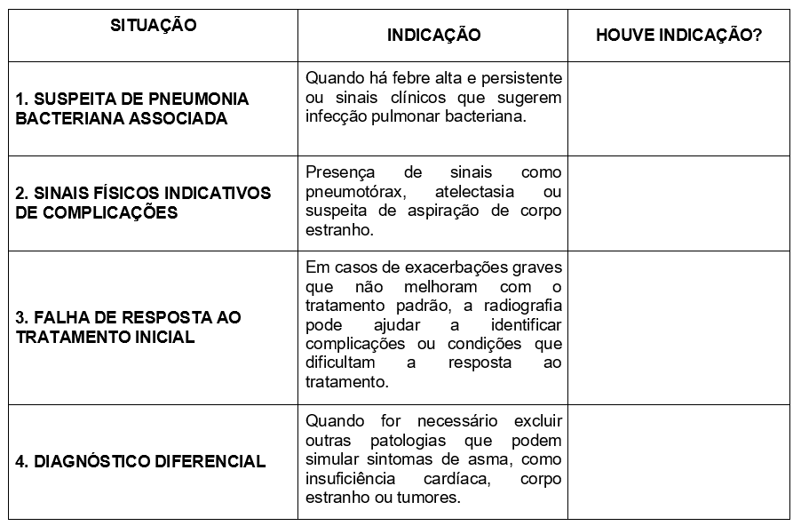 Já na asma a radiografia de tórax não é recomendada rotineiramente, devendo ser criteriosa, baseada na avaliação clínica e na presença de sinais ou sintomas que indiquem complicações ou diagnósticos alternativos, tais como: 1- Suspeita de pneumonia bacteriana associada (quando há febre alta e persistente ou evidências clínicas que sugerem infecção pulmonar bacteriana); 2- Sinais físicos indicativos de complicações (como pneumotórax, atelectasia ou inalação de corpo estranho); 3- Falha de resposta ao tratamento inicial (em casos de exacerbações graves que não melhoram com o tratamento padrão, a radiografia pode auxiliar na identificação de possíveis complicações ou diagnósticos diferenciais); 4- Diagnóstico diferencial (quando há necessidade de excluir outras condições que possam mimetizar a asma, como insuficiência cardíaca, corpo estranho ou tumor). (Jornal Brasileiro de Pneumologia, 2007).
