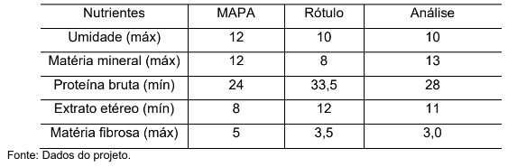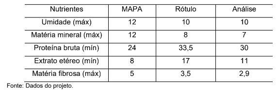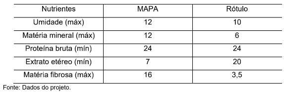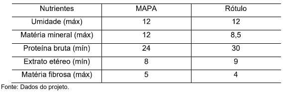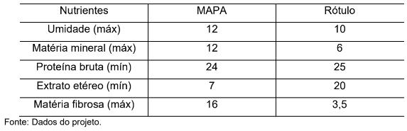 Os valores observados foram comparados com os valores presentes nos rótulos das rações, considerando os valores mínimos e máximos permitidos pelo Ministério da Agricultura, Pecuária e Abastecimento – MAPA. Também foram avaliadas as informações de manejo alimentar presentes nos rótulos das rações, se as mesmas se enquadraram no recomendado pelo MAPA.
