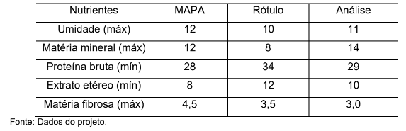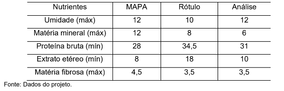 A proteína bruta foi de 28%, 34,5% e 31%, sendo o valor da análise baixo do valor mostrado no rótulo, mas apresentando conformidade com o MAPA; o extrato etéreo foi de 8%, 18% e 10% sendo o valor da análise abaixo do valor mostrado no rótulo, mas apresentando conformidade com o MAPA e a matéria fibrosa de 4,5%, 3,5% e 3,5% manteve a conformidade com o MAPA e com o valor do rótulo e análise.