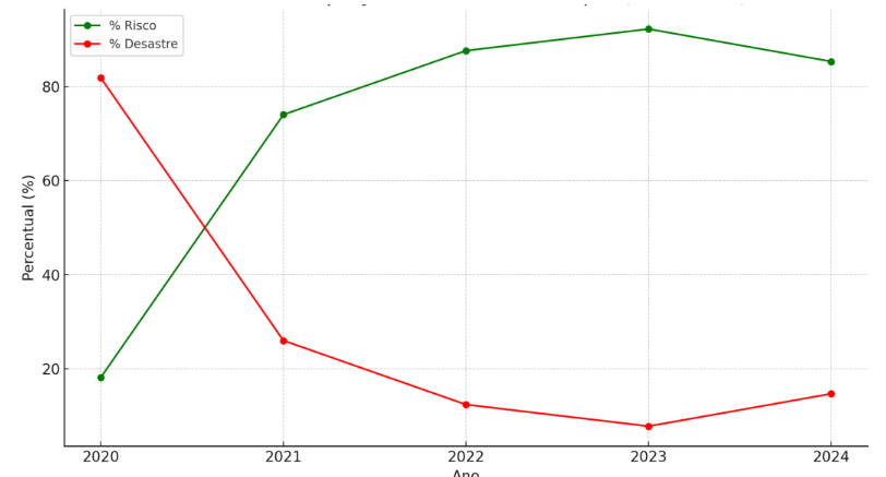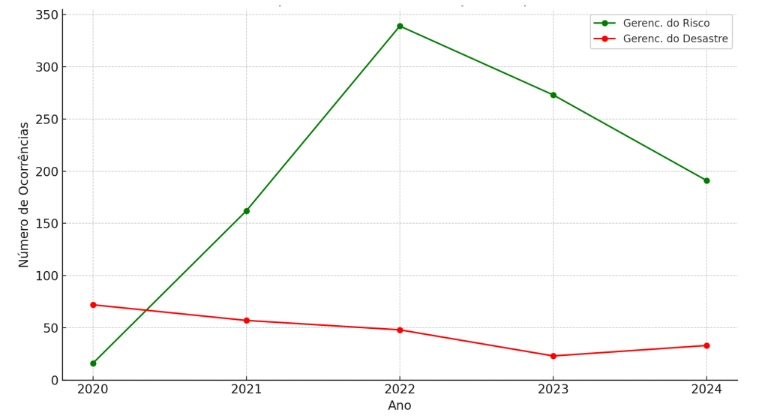 No último ano da série, 2024, foram registradas 224 ocorrências. Destas, 191 (85,3%) foram de gerenciamento do risco e 33 (14,7%) de gerenciamento do desastre. Observa-se uma predominância clara de ocorrências relacionadas ao gerenciamento do risco (Grupo 1), que atingiram mais de 70% do total em todos os anos, com picos de até 92,2% em 2023. A presença das atividades de resposta (Grupo 2) diminuiu ao longo do tempo, de 81,8% em 2020 para aproximadamente 14,7% em 2024, evidenciando uma maior ênfase na prevenção.
