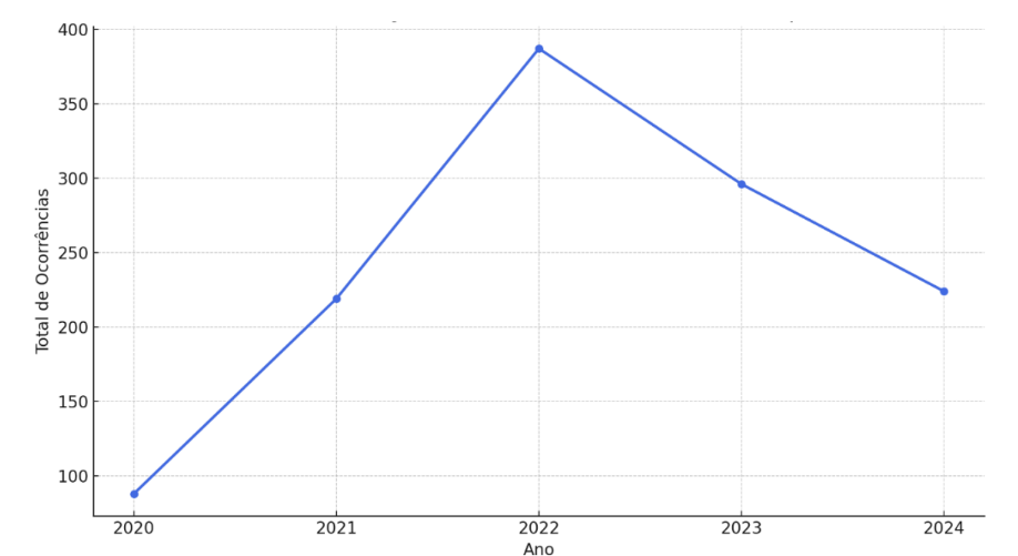 A evolução do número total de ocorrências evidencia três momentos distintos ao longo do período: um primeiro momento de baixa atividade em 2020 (com 88 registros), um segundo momento de crescimento expressivo até 2022 (culminando com 387 ocorrências), seguido de uma fase de estabilização e leve redução nos anos de 2023 e 2024. O pico registrado em 2022 pode ser associado à intensificação das ações preventivas e à reestruturação institucional pós-pandemia, enquanto a redução posterior sugere maior eficácia na mitigação de riscos e institucionalização das rotinas de prevenção.