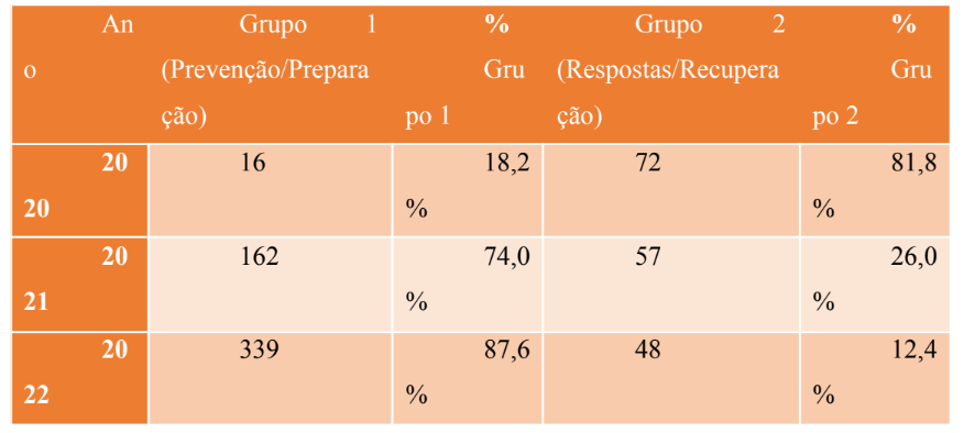 A análise comparativa entre os grupos mostra uma mudança de paradigma no foco operacional da Unidade. Enquanto em 2020 predominavam as ações de resposta e recuperação (81,8%), nos anos seguintes observa-se um fortalecimento progressivo das iniciativas de prevenção e preparação. Tal transição operacional pode ser interpretada como um reflexo direto da adoção de estratégias baseadas na lógica do gerenciamento proativo de riscos, em substituição ao modelo tradicional centrado na resposta aos desastres já ocorridos.
