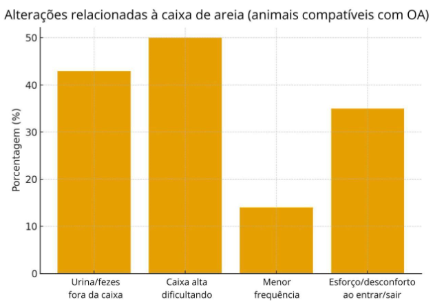 Os responsáveis expuseram alterações de comportamento motor, como evitar acessar locais que anteriormente frequentavam com facilidade, postura encurvada e rigidez ao andar; dentre os animais positivos, 35,7% apresentaram os sinais, 35,7% apenas postura encurvada e 28,6% apenas rigidez. Também foram observadas alterações no comportamento relacionado à caixa de areia, como hesitação ao entrar, esforço para se acomodar e preferência por locais com acesso mais fácil, sugerindo desconforto associado à mobilidade reduzida. Sendo 42,9% dos animais compatíveis urina ou fezes fora da caixa ou dificuldade para utilizá-la e entre esses 50% relatou que a caixa de areia era do tipo alta, o que dificultava o acesso e a utilização pelos animais, 14% diminuiu a frequência de ida à caixa ao decorrer dos anos observado em animais a partir de 8 anos e 35% apresentaram esforço ou desconforto ao entrar ou sair dela.