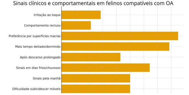 Embora existam poucos estudos específicos sobre gatos, pesquisas já feitas mostram que entre 16,5% e 91% dos felinos avaliados por radiografia apresentaram alterações compatíveis com a OA, mesmo não demonstrando sinais claros. (Kerwin, 2010). Ainda que frequentemente subdiagnosticada, devido à natureza discreta dos indicadores clínicos (Maniaki et al., 2021), Além de causar dor e diminuição da mobilidade, a OA também pode levar a sinais comportamentais, como agressividade, alteração nas interações sociais e perda do vínculo humano-animal. (Deabold et al.,2023). Do mesmo modo, os sinais clínicos incluem evidências de dor, sensibilidade, diminuição da amplitude de movimento, inchaço, rigidez, atrofia muscular, crepitação e derrame (Johnson et al., 2020).