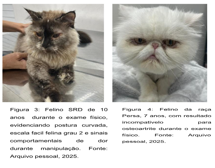 Foram avaliados 25 felinos com idade igual ou superior a cinco anos, sem restrição quanto a idades, sexos, pesos, padrões alimentares, condições ambientais, comportamentos ou comorbidades, atendidos na Clínica Escola Veterinária da Universidade Iguaçu (UNIG). Destes, 56% dos animais apresentaram sinais clínicos compatíveis com OA, sendo a maioria composta por indivíduos idosos, obesos ou com alguma comorbidade secundária, como FIV (Vírus da Imunodeficiência Felina), FeLV (Vírus da Leucemia Felina), DRC (Doença Renal Crônica), DII (Doença Inflamatória Intestinal) ou alergia alimentar. Em 4% dos casos, o diagnóstico de osteoartrite foi confirmado por meio de radiografia, e o animal passou a receber tratamento com Solensia® (anticorpo monoclonal contra o Fator de Crescimento Nervoso – NGF), além de corticosteroides e suplementos nutricionais, o que contribuiu para a redução dos sinais clínicos, podendo ter mascarado a manifestação completa da doença em outros exames.