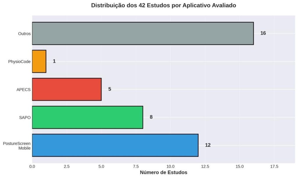 Figura 1. Distribuição dos 42 estudos incluídos por aplicativo avaliado. PSM (PostureScreen Mobile) foi o aplicativo mais estudado (n=12), seguido por SAPO (n=8), APECS (n=5) e PhysioCode (n=1).