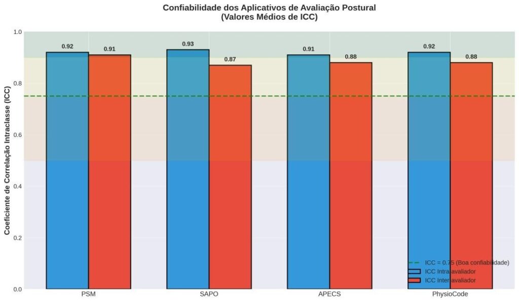 Figura 2. Confiabilidade dos principais aplicativos de avaliação postural. Valores médios de ICC (Coeficiente de Correlação Intraclasse) intra e inter-avaliador. Todos os aplicativos atingiram ICC > 0,75, indicando confiabilidade boa a excelente.