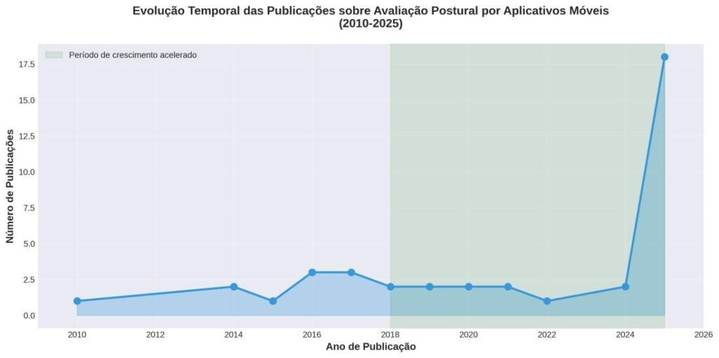 Figura 3. Evolução temporal das publicações sobre avaliação postural por aplicativos móveis (2010-2025). Observa-se crescimento exponencial a partir de 2018, com pico em 2025.