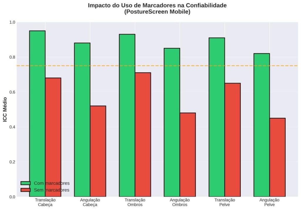 Figura 4. Impacto do uso de marcadores anatômicos na confiabilidade das medidas (PostureScreen Mobile). O uso de marcadores aumenta significativamente o ICC, especialmente para medidas angulares.
