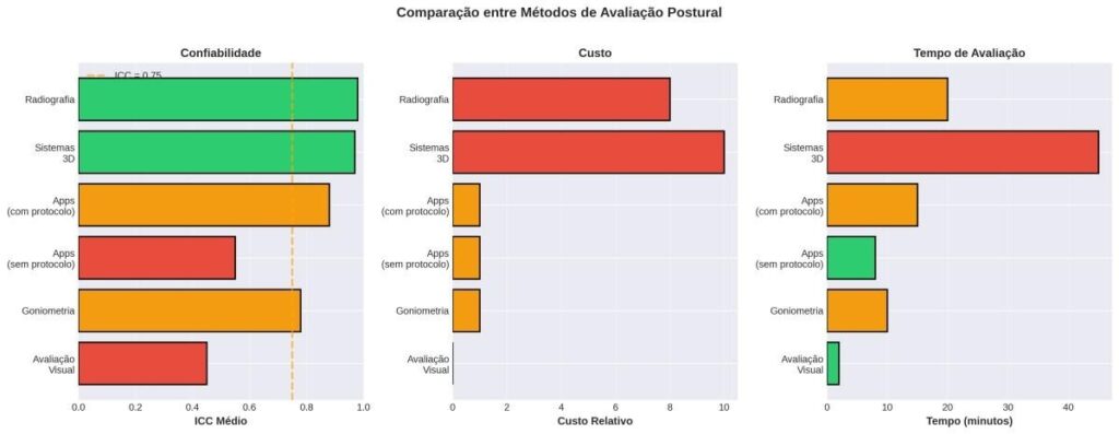 Figura 5. Comparação entre diferentes métodos de avaliação postural quanto a confiabilidade, custo e tempo de avaliação. Aplicativos móveis com protocolo adequado apresentam ICC médio de 0,88, calculado com base nos quatro aplicativos principais (PSM, SAPO, APECS, PhysioCode) detalhados na Figura 2.