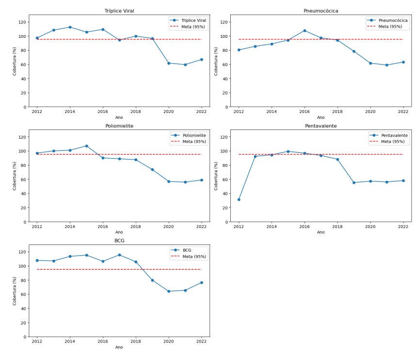 Em relação à vacina Pneumocócica, observou-se crescimento gradual da cobertura entre 2012 e 2015, ainda abaixo da meta de 95%. Apenas nos anos de 2016 e 2017 a cobertura atingiu valores iguais ou superiores à meta. A partir de 2018, iniciou-se uma queda contínua, com reduções acentuadas entre 2019 e 2020. Durante o período pandêmico, a cobertura manteve-se persistentemente baixa, variando em torno de 59% a 63%, sem evidência de recuperação até 2022.