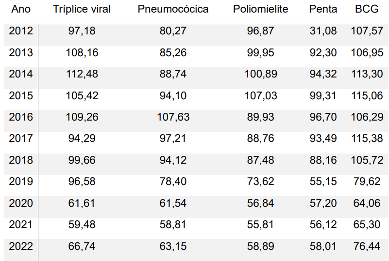 Em suma, o foco deste trabalho residiu na análise da evolução da cobertura vacinal de imunobiológicos do calendário básico infantil no estado do Rio de Janeiro, no período de 2012 a 2022. Os resultados demonstraram redução progressiva das coberturas vacinais ao longo da série histórica, com queda mais acentuada a partir de 2019 e agravamento durante o período pandêmico, sem recuperação adequada até o final do período analisado.