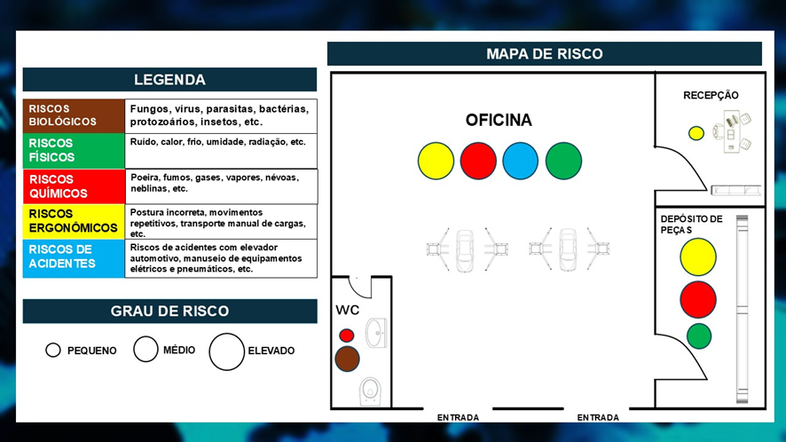 Analisar a construção e a aplicação do mapa de risco em uma oficina mecânica, identificando os perigos presentes no ambiente de trabalho e avaliando sua contribuição para a prevenção de acidentes e para a promoção de um ambiente laboral mais seguro.
