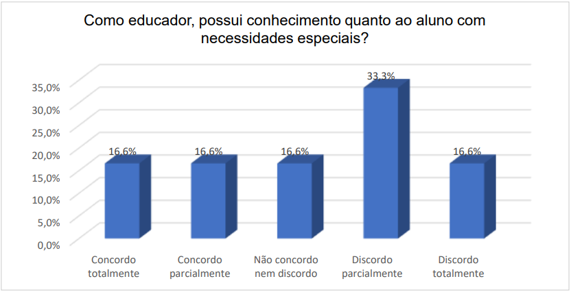 No gráfico, fica evidente que muitos professores não estão preocupados em buscar por iniciativa própria, o conhecimento necessário, para que possa lidar com as mais diferentes situações no convívio diário com alunos que possuem necessidades especiais. Com tanta facilidade de acesso as informações, muitos professores ainda ficam esperando por outros, ao invés de buscarem conhecer as necessidades de seus alunos, para assim, trabalharem dentro das limitações dos seus alunos especiais, desenvolvendo de forma metodológica, seu potencial, para abrir caminhos para a aquisição do conhecimento por parte desses alunos.