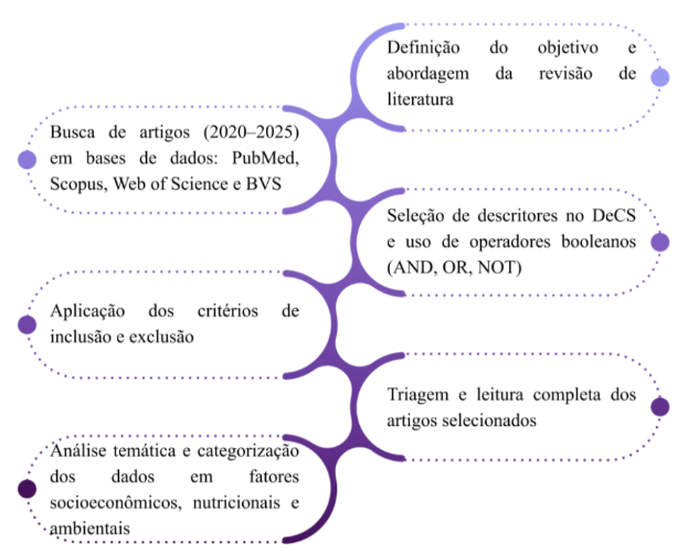 LEGENDA: O fluxograma apresenta as etapas metodológicas adotadas na revisão de  literatura, desde a definição dos objetivos e estratégias de busca até a análise temática dos  estudos selecionados, assegurando rigor científico e abrangência na identificação das  evidências sobre os determinantes do crescimento e desenvolvimento na infância.