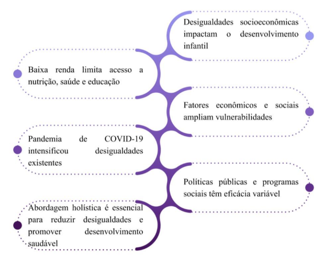 A literatura revisada indica que o impacto dessas desigualdades se materializa não  apenas através da falta de acesso a nutrição adequada e cuidados de saúde, mas também por  meio da ausência de ambientes de aprendizagem enriquecedoras. Essas condições são  agravadas pelo estresse familiar contínuo, que compromete tanto as capacidades parentais  quanto o bem-estar emocional das crianças. A pandemia de COVID-19, de acordo com a  literatura, exacerbou essas vulnerabilidades, tornando as disparidades no acesso a recursos  ainda mais evidentes. Muitas crianças, especialmente aquelas de contextos socioeconômicos  mais desfavorecidos, enfrentaram dificuldades adicionais com o fechamento de escolas e a  interrupção de serviços fundamentais (Cordeiro et al., 2024).