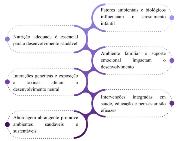 No que diz respeito às influências ambientais e biológicas, os resultados ilustraram  como estas desempenham um papel igualmente crucial no desenvolvimento infantil.  Deficiências nutricionais, notadamente a desnutrição, foram identificadas como principais  culpadas por atrasos de crescimento e desenvolvimento cognitivo. Estudos demonstraram que  a qualidade das interações no ambiente familiar é um determinante significativo do  desenvolvimento infantil saudável, com interações parentais positivas fomentando resiliência  e competência cognitiva. A literatura destaca ainda que ambientes domésticos disfuncionais  aumentam a incidência de problemas emocionais e comportamentais. Intervenções holísticas  que promovem ambientes seguros, estimulantes e nutritivos são claramente necessárias para  mitigar efeitos biológicos adversos, com o suporte familiar e comunitário desempenhando um  papel de destaque (Oliveira et al., 2025).