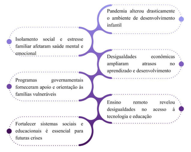 A pandemia de COVID-19 apresentou desafios únicos ao desenvolvimento infantil, ao  alterar drasticamente o cenário de crescimento das crianças. O fechamento de escolas e a  interrupção de serviços essenciais destacaram as vulnerabilidades estruturais já existentes. O  impacto sobre famílias de baixo nível socioeconômico foi desproporcional, ampliando as  desigualdades no acesso a recursos educacionais e de saúde básicos, resultando em lacunas  significativas no desenvolvimento cognitivo e social (Cordeiro et al., 2024).