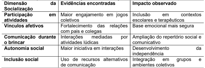 Os impactos da estimulação na socialização de crianças com TEA podem ser sintetizados na Tabela 3, que apresenta as principais dimensões trabalhadas, as evidências encontradas e os resultados observados nos estudos analisados.