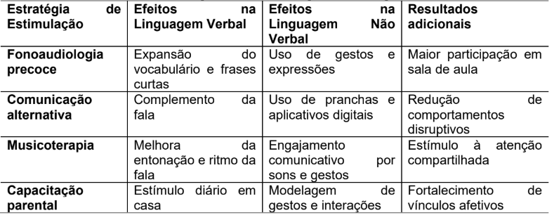 Os resultados descritos podem ser sintetizados na Tabela 2, que apresenta os efeitos da estimulação precoce sobre a linguagem verbal, a linguagem não verbal e outros aspectos relacionados ao desenvolvimento comunicativo de crianças com TEA.