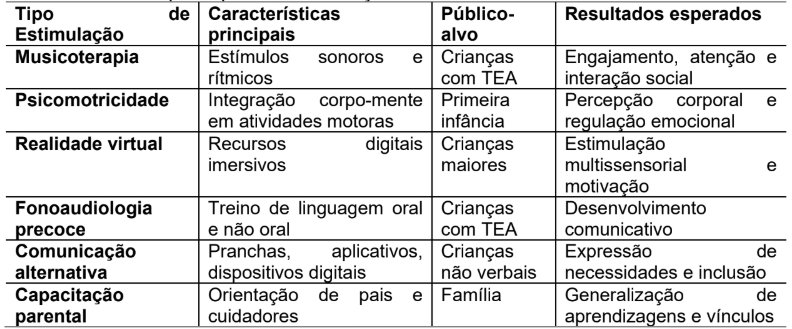 A análise da tabela evidencia que as práticas de estimulação não atuam isoladamente, mas se complementam em um modelo integrado. Enquanto recursos clínicos, como a fonoaudiologia e a comunicação alternativa, fornecem canais de expressão, estratégias inovadoras, como a musicoterapia e a realidade virtual, ampliam a motivação e a interação. Já a psicomotricidade fortalece a regulação emocional, e a capacitação parental assegura a continuidade da intervenção em contextos familiares. Assim, a literatura demonstra que o sucesso da estimulação em crianças com TEA depende da articulação entre diferentes práticas, aplicadas de maneira precoce, estruturada e interdisciplinar.