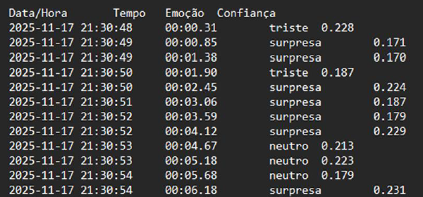 O experimento foi realizado em ambiente controlado e remoto, com captura das expressões faciais durante a exposição dos participantes a um vídeo publicitário. As aquisições utilizaram câmera RGB (1080p, 30 fps), posicionada frontalmente sob iluminação uniforme (Figura 3). A Figura 4 apresenta um recorte dos arquivos .txt gerados pelo sistema, nos quais são registrados, de forma estruturada, a data e hora da captura, o tempo relativo ao estímulo, a emoção classificada e o valor de confiança associado. Esse formato possibilita análises quantitativas e temporais das reações emocionais posteriormente, preservando a anonimização dos participantes, uma vez que não há armazenamento de imagens ou identificadores individuais.