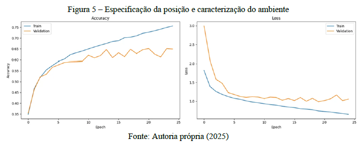 O desempenho do modelo foi avaliado por meio da acurácia e da função de perda, conforme a figura 5. Como referência, consideraram-se dois baselines: um classificador aleatório, com acurácia teórica de 14,2%, e a previsão constante da classe majoritária, com 24,7%. O modelo treinado superou ambos, indicando aprendizado dos padrões faciais.