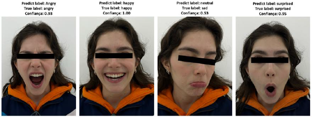 FER2013, mostrou-se adequada para os objetivos propostos. Os resultados de desempenho, com 75,60% de acurácia no treino e cerca de 64,89% na validação, revelaram que o modelo foi capaz de aprender padrões emocionais relevantes, embora tenha apresentado sinais de sobreajuste ao longo das épocas. As curvas de acurácia e perda, mostraram um comportamento coerente: emoções mais evidentes, como felicidade e surpresa, foram reconhecidas com maior segurança, enquanto emoções mais sutis, como tristeza, apresentaram maior grau de confusão.