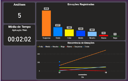 Os testes práticos reforçaram esses achados. O dashboard temporal (figura 11) permitiu visualizar, de maneira intuitiva, como as emoções variavam ao longo dos estímulos publicitários apresentados. Essa visualização ajudou a compreender não apenas quais emoções eram detectadas, mas também em que momento elas surgiam, oferecendo um recurso valioso para análises de campanhas. Além disso, a pesquisa de percepção com os participantes indicou boa aceitação do sistema, com nota média de 8,2 e percepção de acerto próxima a 77%.