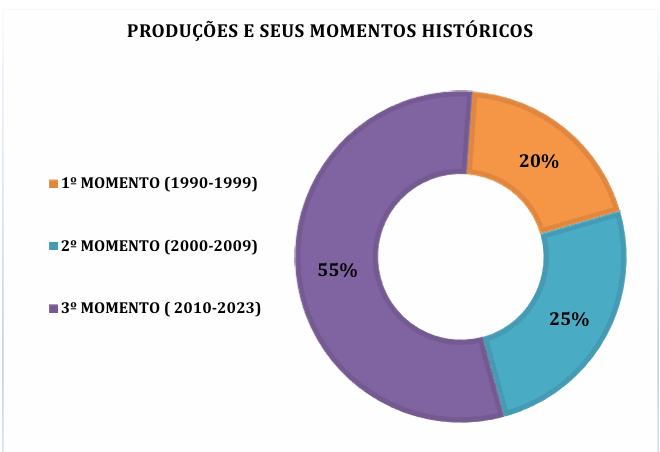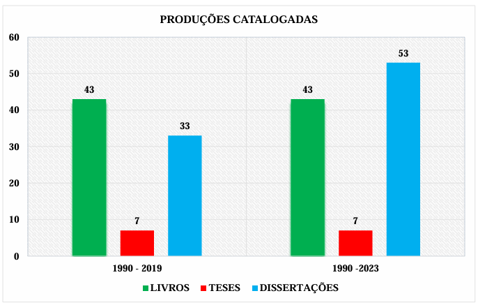 Percebe-se uma permanência no quantitativo das produções de livros e teses realizadas nos dois períodos. E fica visível o quantitativo das dissertações que sofrem um aumento de 33 produções catalogadas até o ano de 2019, para 53 produções catalogadas em 2023, com um acréscimo de 20 trabalhos produzidos em um intervalo de 3 anos por Programas de Pós-graduação em História.