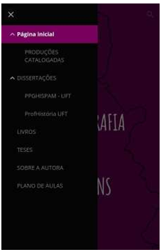 A figura 1 representa o menu da ferramenta de pesquisa onde as informações estão sendo anexadas. A disponibilização do acervo historiográfico do estado Tocantins, dispostos em livros, teses e dissertações referentes aos anos de 1990 a 2023 está disposta nas subpáginas  iniciais para leitura e visualização, já o downloads dos arquivos é possível somente via solicitação, por meio do Gmail vinculado ao site. As informações das obras que serão disponibilizadas correspondem às produções catalogadas durante a pesquisa dentro do campo disciplinar da história.