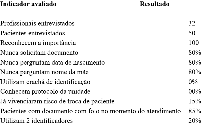 No que tange à posse de documentos de identificação, 85% dos pacientes possuíam documento com foto, enquanto 15% não possuíam nenhum documento no momento do atendimento. Em relação à conferência de dados, constatou-se que apenas 20% dos profissionais utilizam dois identificadores (nome e data de nascimento), enquanto 80% utilizam apenas um identificador, o que contraria as recomendações da Agência Nacional de Vigilância Sanitária (ANVISA), que estabelece o uso de pelo menos dois identificadores para garantir a segurança do paciente (BRASIL, 2013).