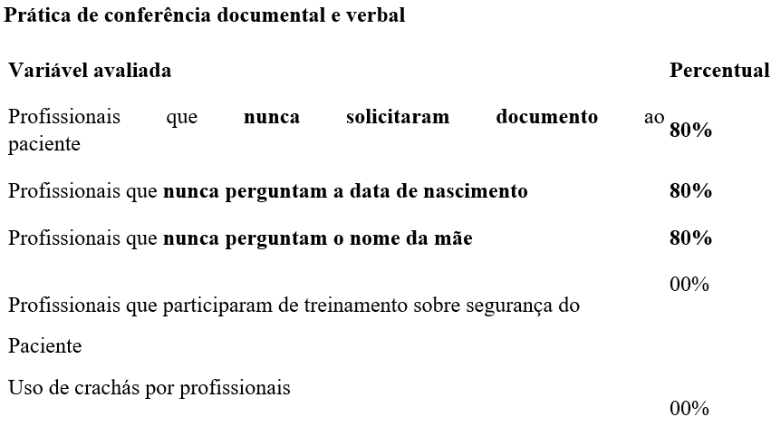 A inconsistência na solicitação e conferência de dados pessoais observada neste estudo reforça lacunas semelhantes identificadas em pesquisas nacionais e internacionais. A literatura destaca que a correta identificação do paciente é um dos pilares da segurança do cuidado, contribuindo para reduzir eventos adversos e melhorar a confiança no sistema de saúde (RIBEIRO et al., 2019).