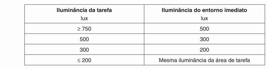Todo ambiente é regulado por alguma forma de normatização, dentro do âmbito de interiores, elementos como acústica, conforto térmico e iluminação, são pontos chave do que se legisla. Para uma boa iluminação, é essencial garantir que os ambientes recebam uma quantidade adequada de luz artificial, proporcionando conforto, segurança e eficiência para as pessoas que os utilizam. Elas ajudam a evitar o cansaço visual e o esforço excessivo dos olhos, o que melhora a concentração e o desempenho nas atividades diárias, sejam elas no trabalho, estudo ou lazer (Fernando, 2023). Outro ponto importante é a eficiência energética, pois as normas orientam o uso racional da energia, contribuindo para a redução do consumo e dos custos relacionados. A qualidade da luz é determinada primariamente pela sua temperatura e seu índice de reprodução de cor (IRC). Esses fatores são cruciais para garantir uma boa reprodução das cores, evitar o ofuscamento, e consequentemente facilitar a percepção visual e o conforto dos usuários (Fernando, 2023). Uma das normas mais importantes é a ABNT NBR ISO 8995-1/2013: Iluminação de ambientes de trabalho Parte 1: Interior. No qual estabelece requisitos técnicos voltados para garantir condições visuais adequadas, promovendo segurança, conforto e desempenho visual nas atividades realizadas em espaços internos e externos. Baseada em diretrizes internacionais da ISO (Organização Internacional para Padronização) e da CIE (Comissão Internacional de Iluminação), foi adotada pela ABNT (Associação Brasileira de Normas Técnicas) para padronização no Brasil. Essa norma define critérios como os níveis de iluminância recomendados para diferentes tipos de tarefas visuais, a uniformidade da luz nos ambientes, o controle do ofuscamento — para evitar desconforto ou prejuízo à visão —, a reprodução de cores, considerando a fidelidade cromática sob diferentes fontes de luz, além do direcionamento e da distribuição da luz, com o objetivo de melhorar a visibilidade e reduzir sombras indesejadas. Um dos principais aspectos da norma é a definição de níveis mínimos de iluminância adequados a diferentes atividades. Esses valores são apresentados em tabelas organizadas por tipo de ambiente e tarefa visual, levando em consideração o grau de complexidade e exigência da atividade desempenhada. Conforme a tabela a seguir de iluminância no entorno imediato, que devem ser relacionadas com a iluminância da área de tarefa que vai de 20 até 5000 lux, convém que proveja uma distribuição bem balanceada da luminância no campo de visão. A norma trata do ofuscamento, orientando que o projeto luminotécnico minimize tanto o ofuscamento direto quanto o refletido. Isso implica considerar a posição das luminárias, o controle de brilho, o ângulo de visão do usuário e o uso de superfícies com refletâncias adequadas. A intenção é promover uma distribuição equilibrada de luminância entre a área de tarefa, o entorno e demais superfícies, garantindo conforto visual e evitando fadiga ocular.