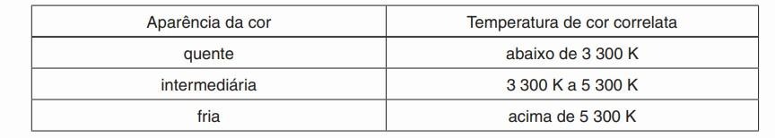 Outro ponto importante abordado na norma é a aparência da cor da luz, que se refere à tonalidade percebida da fonte luminosa, usualmente classificada como quente (abaixo de 3300 K), neutra (entre 3300 K e 5300 K) efria (acima de 5300 K), medida em temperatura de cor correlata (Kelvin) (Figura 3).