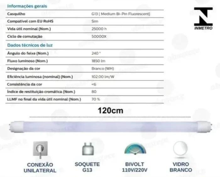 O ambiente possui teto branco e paredes de tonalidade clara, sendo caracterizado como de refletância média. De acordo com a NBR 5413 da ABNT, o nível de iluminância recomendado para salas de aula é de 300 lux. Para atender a essa exigência, foi realizado o cálculo utilizando lâmpadas tubulares LED T8 de 18 W, instaladas em luminárias contendo duas lâmpadas cada. Conforme a imagem a seguir que descreve o tipo de luminária (Figura 04).
