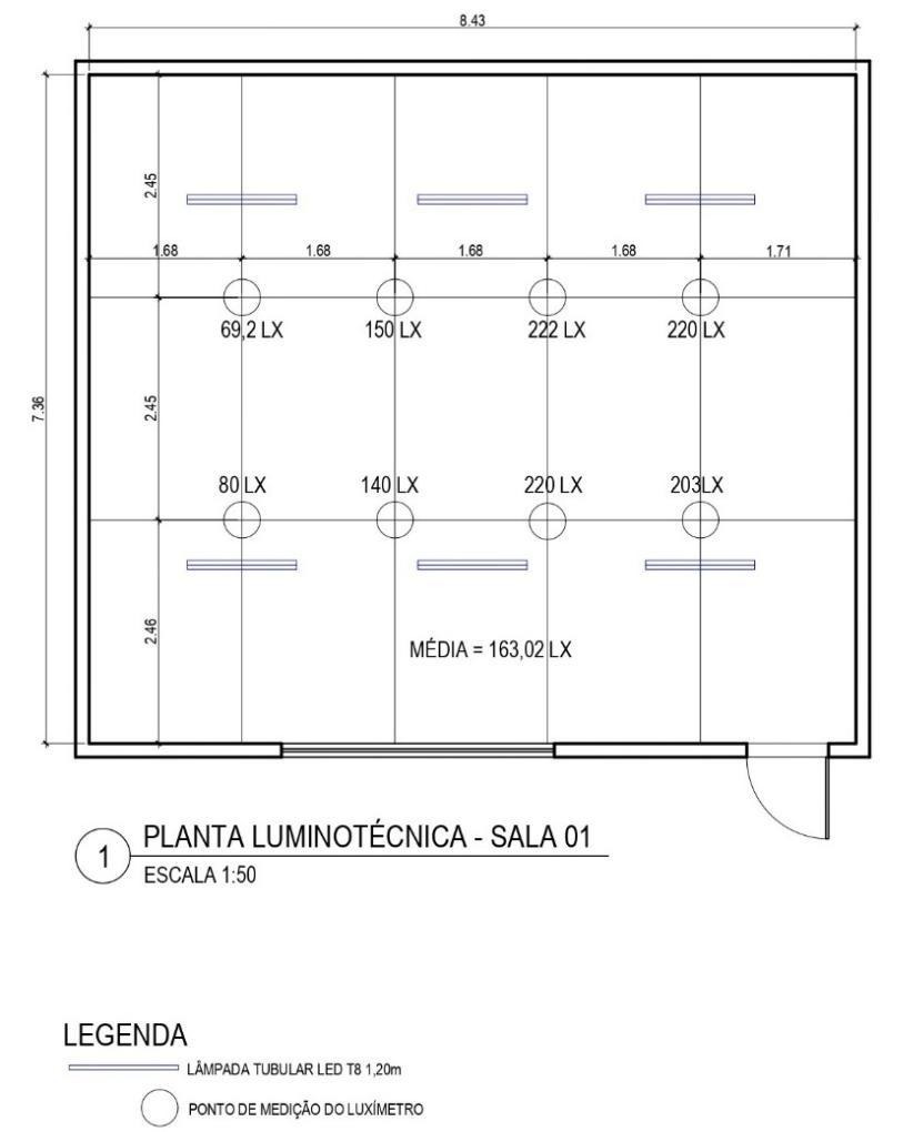 A sala possui área de 63,75 m², pé direito de 3,20 m, altura da área de trabalho 76cm, 10 lâmpadas sendo 2 por luminária, iluminância média de 221,12 lux. Alguns pontos chegam próximo a iluminância mínima de 300 lux, no entanto a iluminância geral não é atendida.